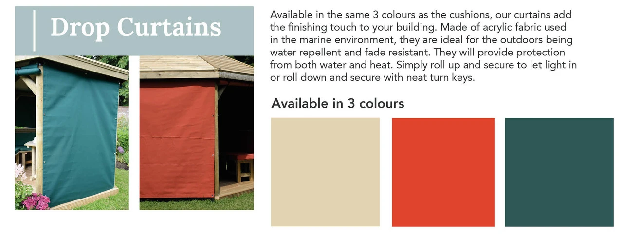 Add the finishing touch to your Gazebo, with this beautiful Wooden Garden Gazebo Curtains. The marine grade fabric used in making these curtains, is water repellent and fade resistant, ensuring that they are ideal for use outdoors. These curtains also feature turn keys which can be used to secure them in place when rolled down. Available in a choice of 3 colours, the wooden gazebo curtains are sure to enhance your garden space.