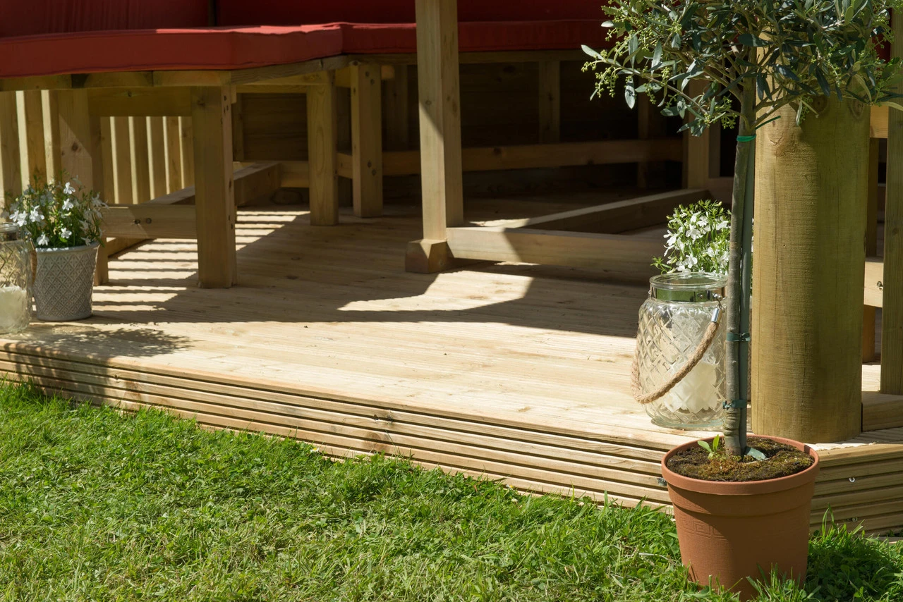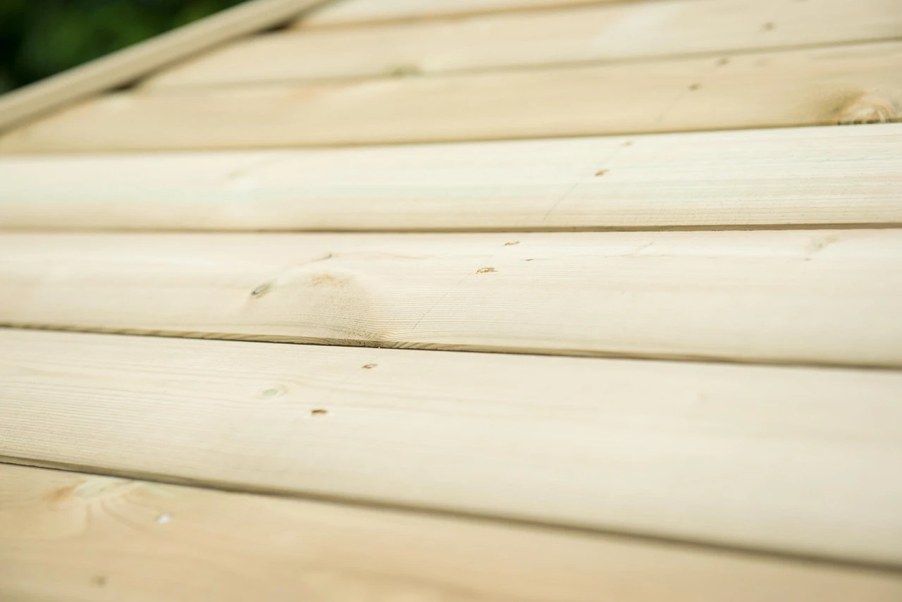 the Hexagonal Wooden Garden Gazebo with Timber Roof is ideal for utilising the weather for family mealtimes. made from pressure-treated round Radiata Pine that has been kiln dried and has a lovely smooth sanded surface. Pressure-treated softwood is shaped into a Log Lap roof structure and set on top of a water-proof Tricoya liner to give the Gazebo a simple, attractive, and affordable finish. The wood has a 15 Year Anti-Rot guarantee. The sturdy uprights are fastened to the perimeter frame at the top and the base, which is made of profiled deck planks. This gives the gazebo a tremendous amount of strength and rigidity.