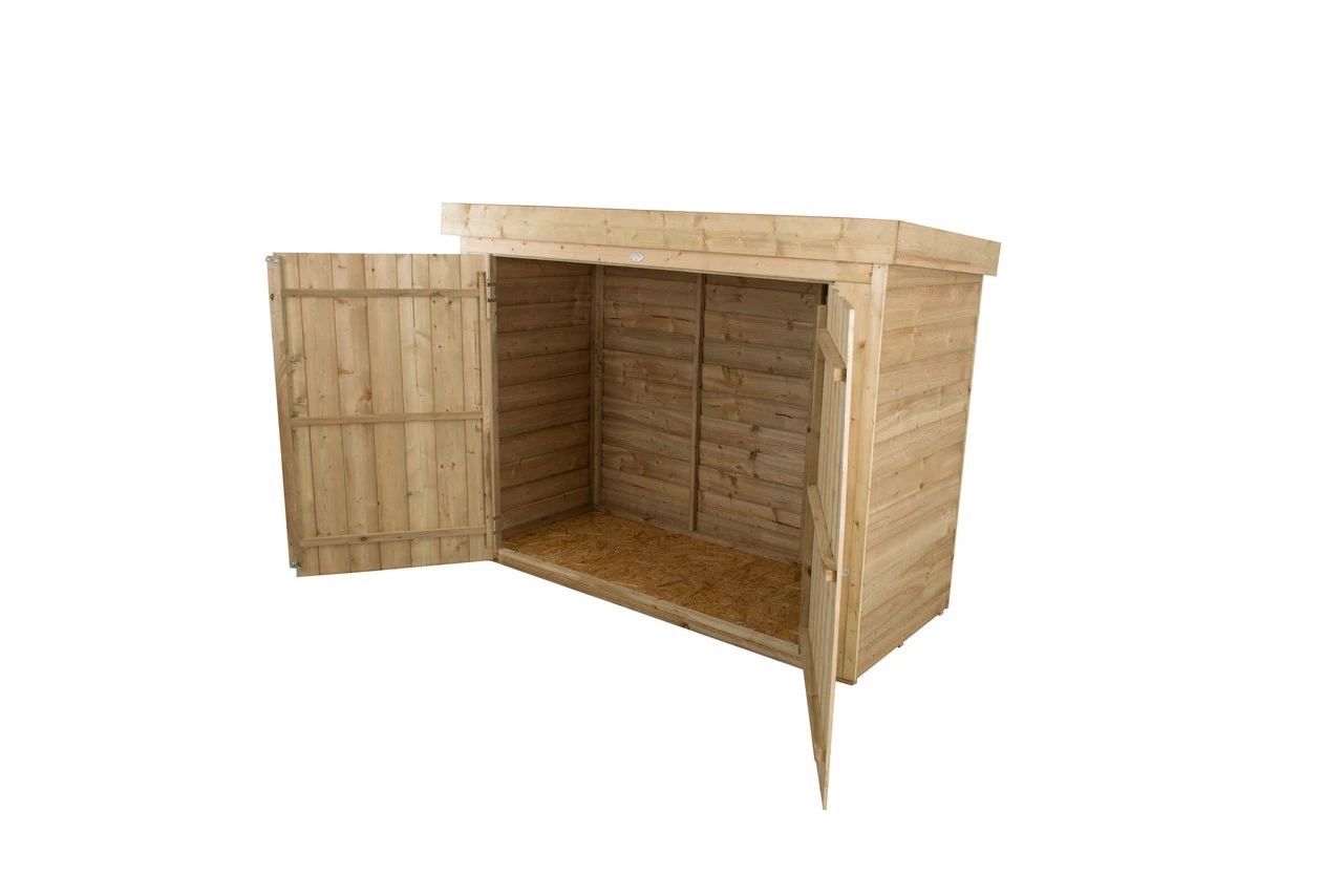 An attractive, spacious and lower height alternative to a shed that won’t clutter up the garden. With large double doors, it is a practical and versatile storage solution for barbeques and larger garden equipment. It is perfect for use as a bike store or mower store. The doors on the generous 2000 litre capacity unit can be secured with a padlock (not included) on the plate hasp and staple latch. This model features traditional overlap panels on the side and back while the front panel and doors are made from smooth-planed shiplap tongue and groove material. All panels are pressure treated to protect against rot and the base is mounted on pressure treated bearers to prevent damage from standing water. Anti-rot pressure treatment gives a 15 year guarantee against fungal decay. Clever design means the Pent roof can be assembled sloping back or forward depending on preference and location. Also available with Apex roof design. Due to current felt availability, the colour supplied may vary from product description.